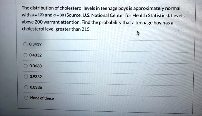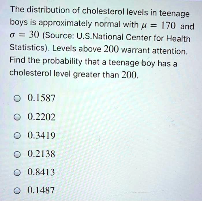 Solved The Distribution Of Cholesterol Levels In Teenage Boys Is Approximately Normal With U 170 And 30 Source U S National Center For Health Statistics Levels Above 200 Warrant Attention Find