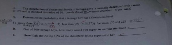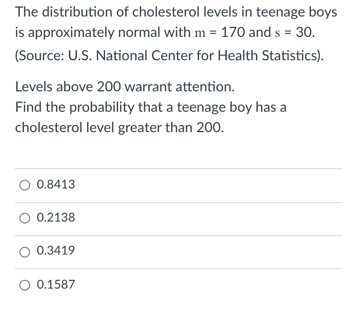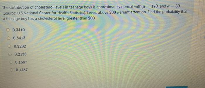 Solved The Distribution Of Cholesterol Levels In Teenage Boys Is Approximately Normal With U 17 And 30 Source U S National Center For Health Statistics Levels Above 200 Warrant Attention Find